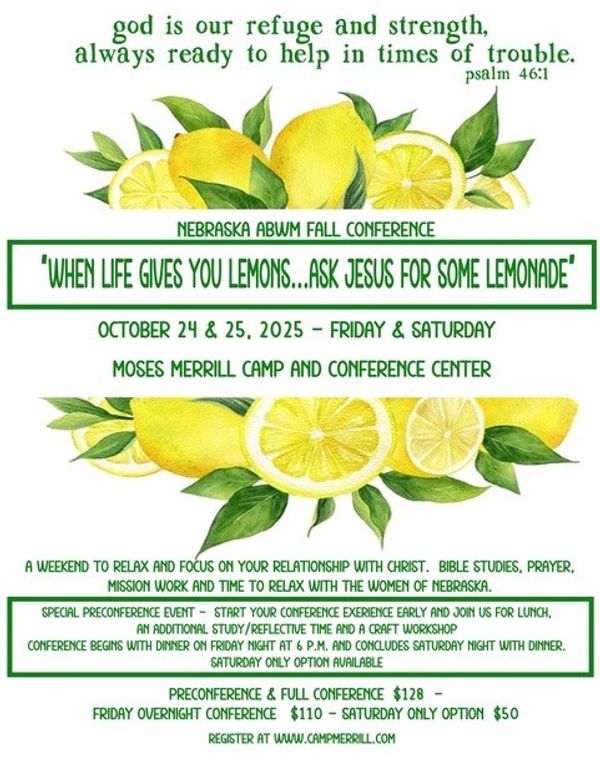 Ladies, come be refreshed and renewed at our ABW Fall Conference — a day of faith, fellowship, and fun! Let’s gather as sisters in Christ to strengthen our hearts and uplift one another. Bring a friend—you won't want to miss it!