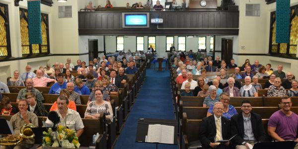 A traditional service with hymns accompanied by piano and organ.